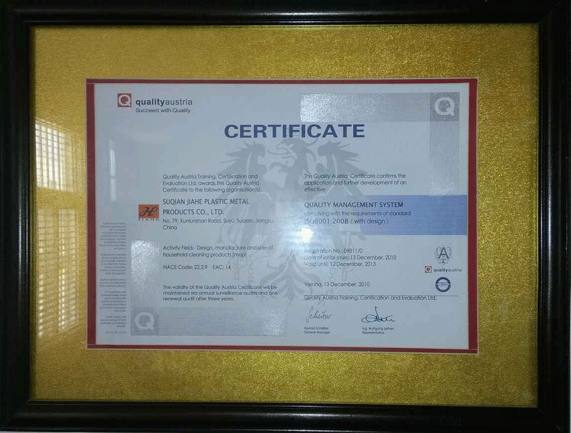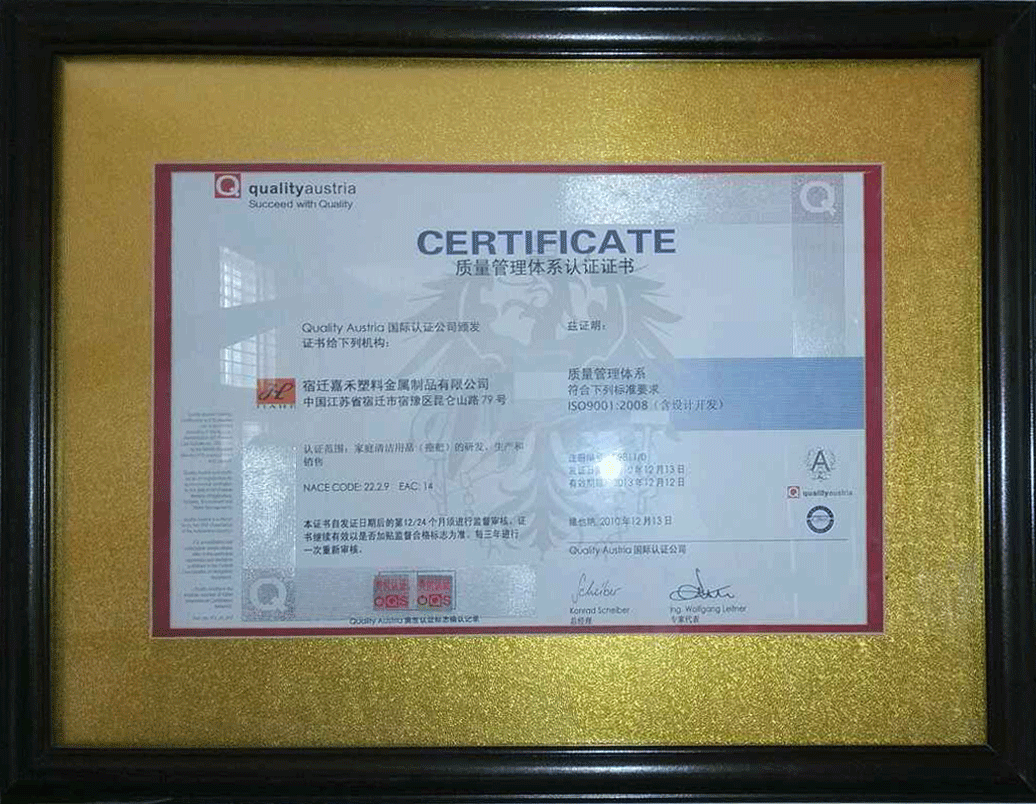 Suqian Jiahe Plastic Metal Products Co.,Ltd. has more than 20 years of mold, plastic products and metal products manufacturing experience, the formation of four series products: cleansing products, plastic products, plastic raw materials, mold development and to undertake external processing. The company has more than 30 product patents, and through ISO9001:2000 international quality management system certification. Currently has with the domestic well-known brands at home and abroad set up long-term strategic partnership, and with independent brand. Golden harvest has a group of outstanding research and development personnel, well-trained staff and advanced production equipment, in the fierce market competition and changing customer requirements, the golden harvest constantly for the overwhelming majority of customers with rich and novel products, with first-class quality, reasonable price and perfect service make customers worry-free, welcome the clients at home and abroad to patronize.
